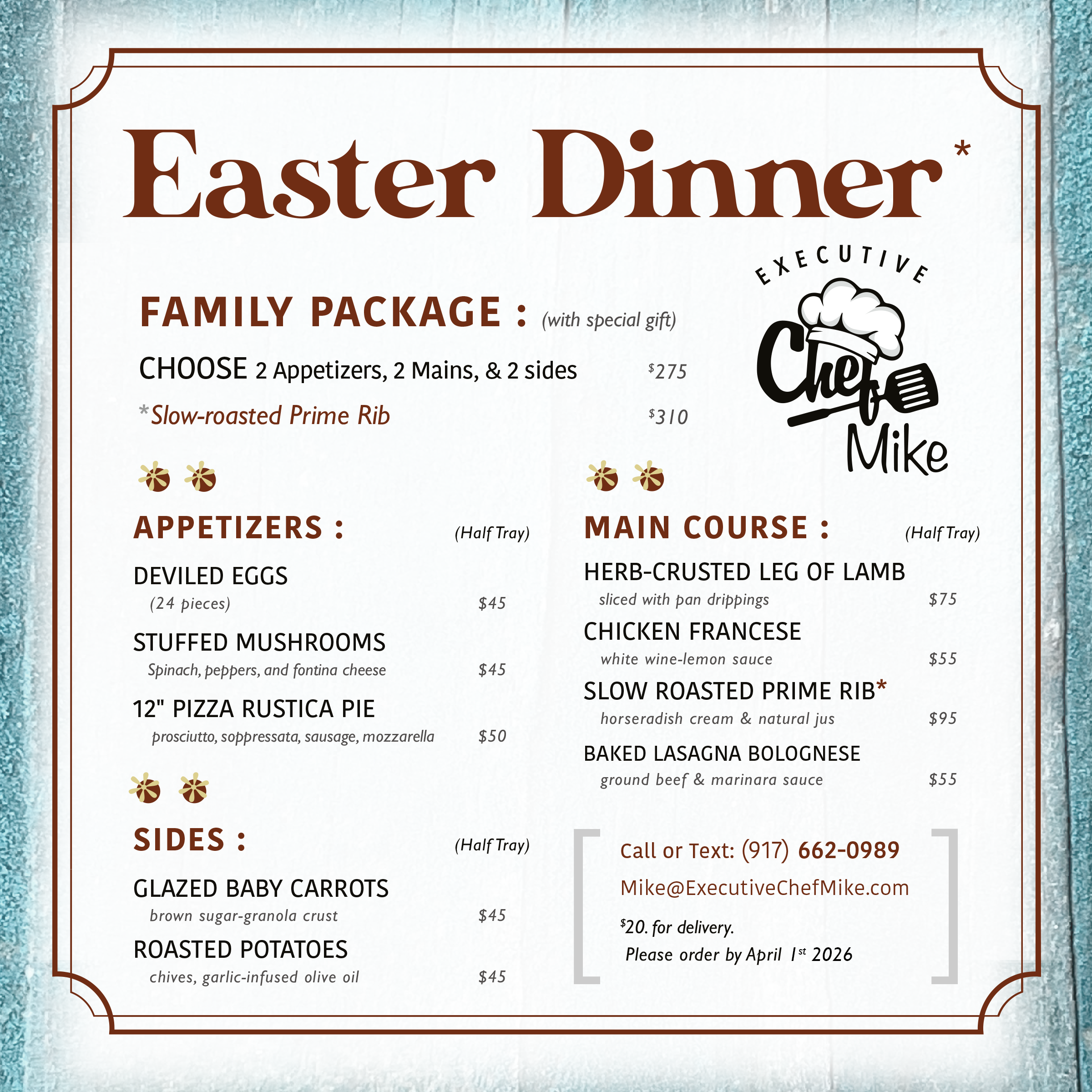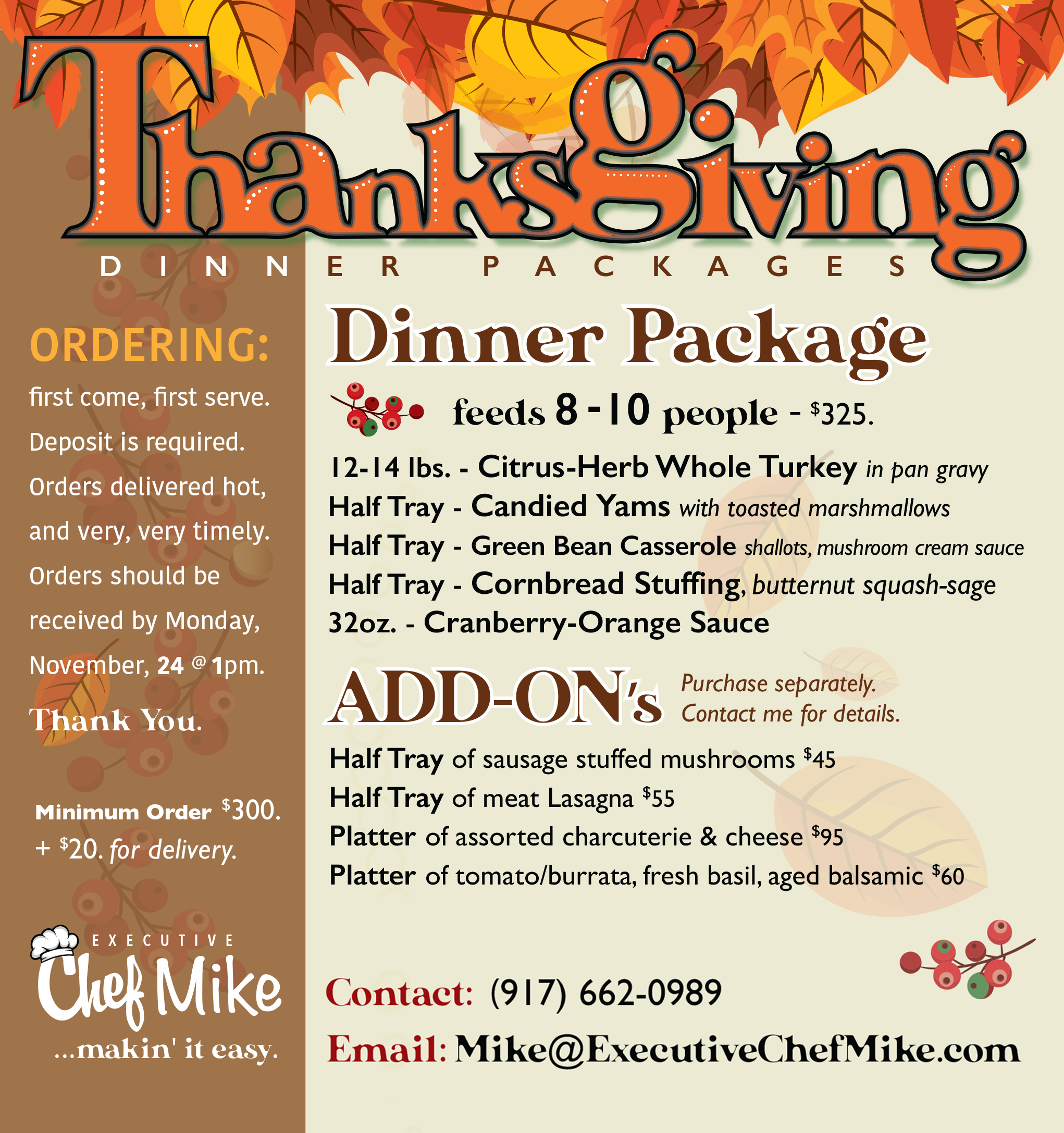 Chef Mike knows you’re not simply ordering dinner—you’re creating a festive setting. A table where the people you care most about feel welcomed, appreciated, and even a little bit spoiled. His goal is to give you the luxury of ease: the confidence that every detail has been considered, every flavor well-balanced, every course prepared with the kind of attention only a chef with his experience and heart can provide.